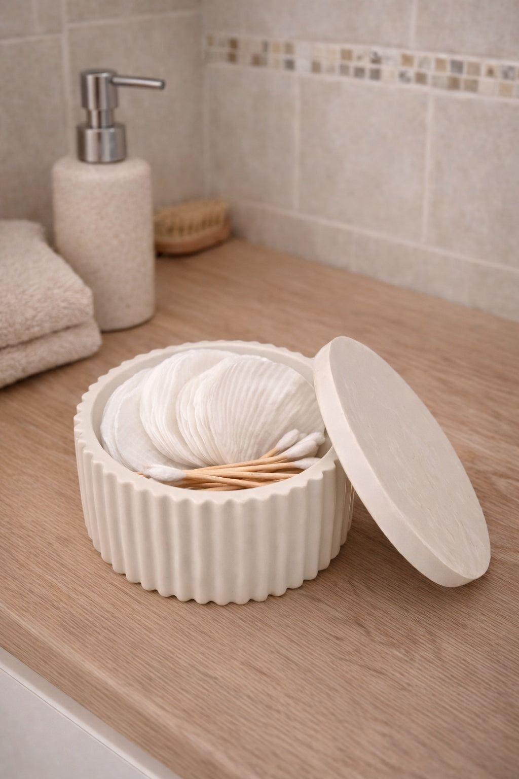 HILJA Säilö – kannellinen rasia. HILJA Säilö on käsin valmistettu, ajattoman kaunis kannellinen rasia pienille arjen aarteille. Pehmeästi uurrettu muoto ja hillitty sävy tekevät siitä rauhallisen osan sisustusta – esineen, jonka voi jättää esille. Rasia sopii esimerkiksi vanulapuille, hiuspinnille, koruille tai muille pienille säilytettäville. Kansi asettuu kevyesti paikalleen ja viimeistelee kokonaisuuden. Jokainen kappale valmistetaan käsin, joten pinnassa ja sävyssä voi esiintyä pieniä, kauniita yksilöllisiä eroja.
