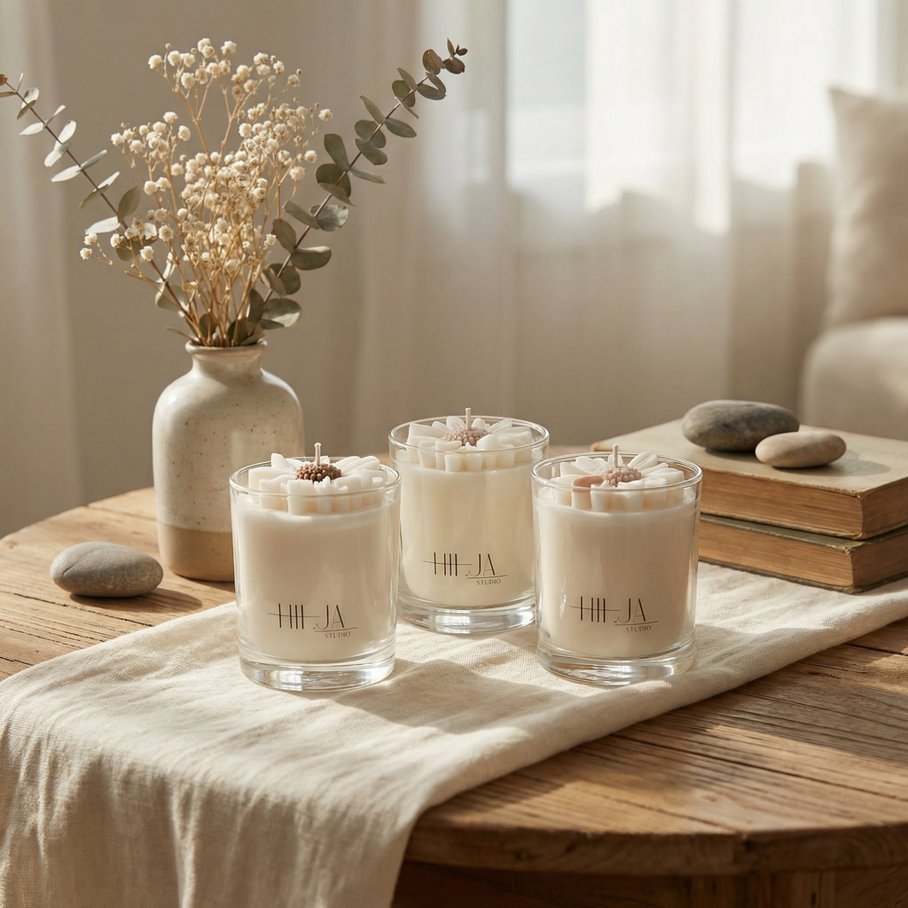 Ajaton valkoinen kukkakynttilä rapsivahasta. Luotu hiljaisiin hetkiin.